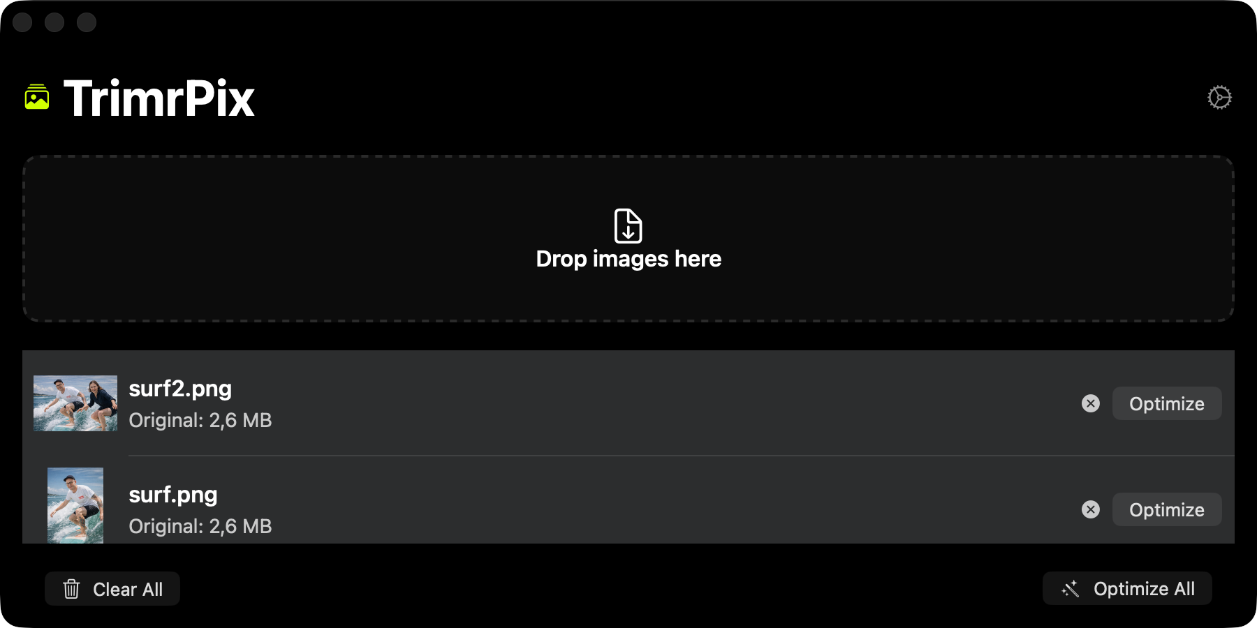 Shrink image file sizes on your Mac without visible quality loss. Drag, drop, optimize, and save space — fast, private, and fully offline.